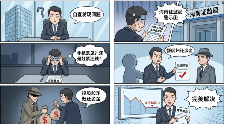 随着监管的加强,事务所不敢冒风险不披露,就提出了两个选项:要么出具非标意见审计报告,要么赶紧把钱还了算自查发现的。