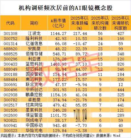 从机构关注情况来看,数据宝统计,截至12月8日,今年以来机构调研10次以上的AI眼镜概念股有9只,如江波龙、隆利科技、亿道信息、安凯微、佰维存储等。